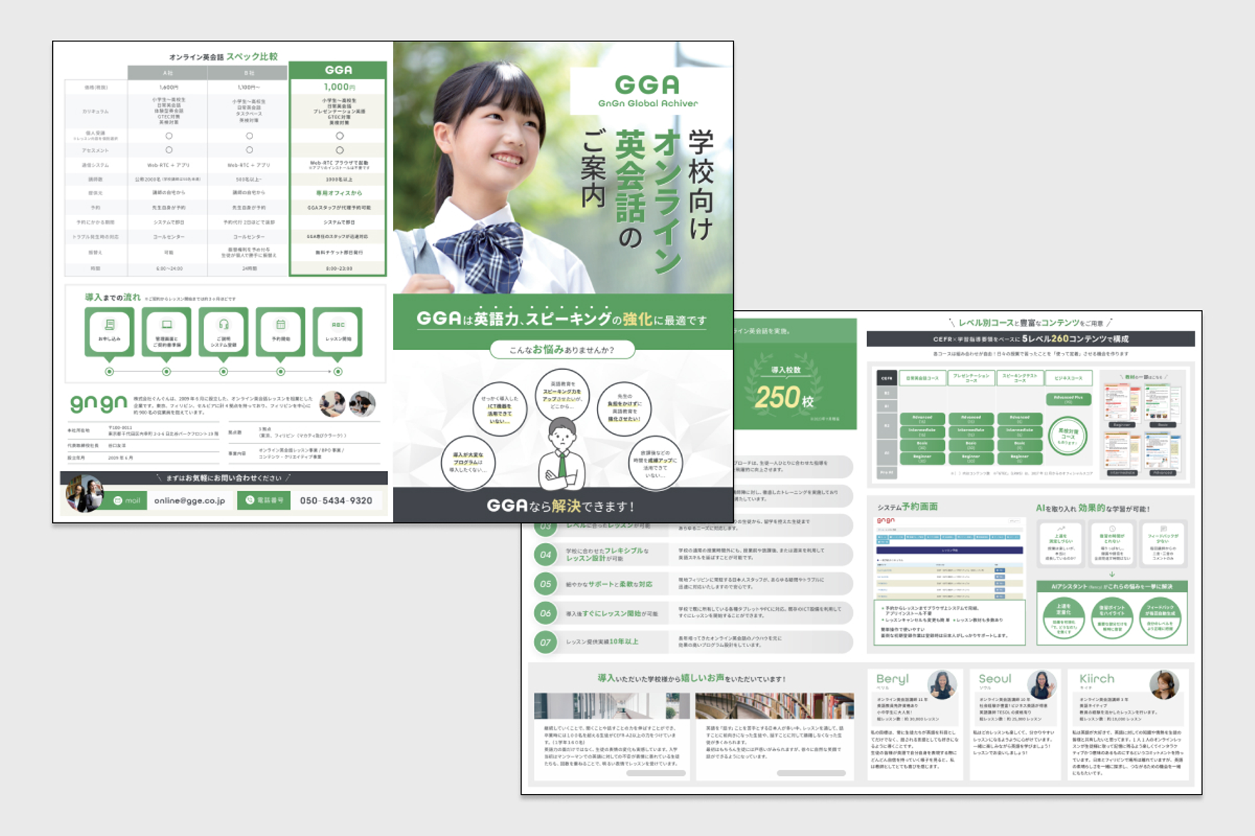 学校向けオンライン英会話の商材「GGA」を説明するためのチラシの制作をご依頼いただきました。内容の整理からお手伝いさせていただき、ページ構成企画、ライティング、デザインを行いました。GGAのことがすぐに伝わるチラシにすることを心がけました。