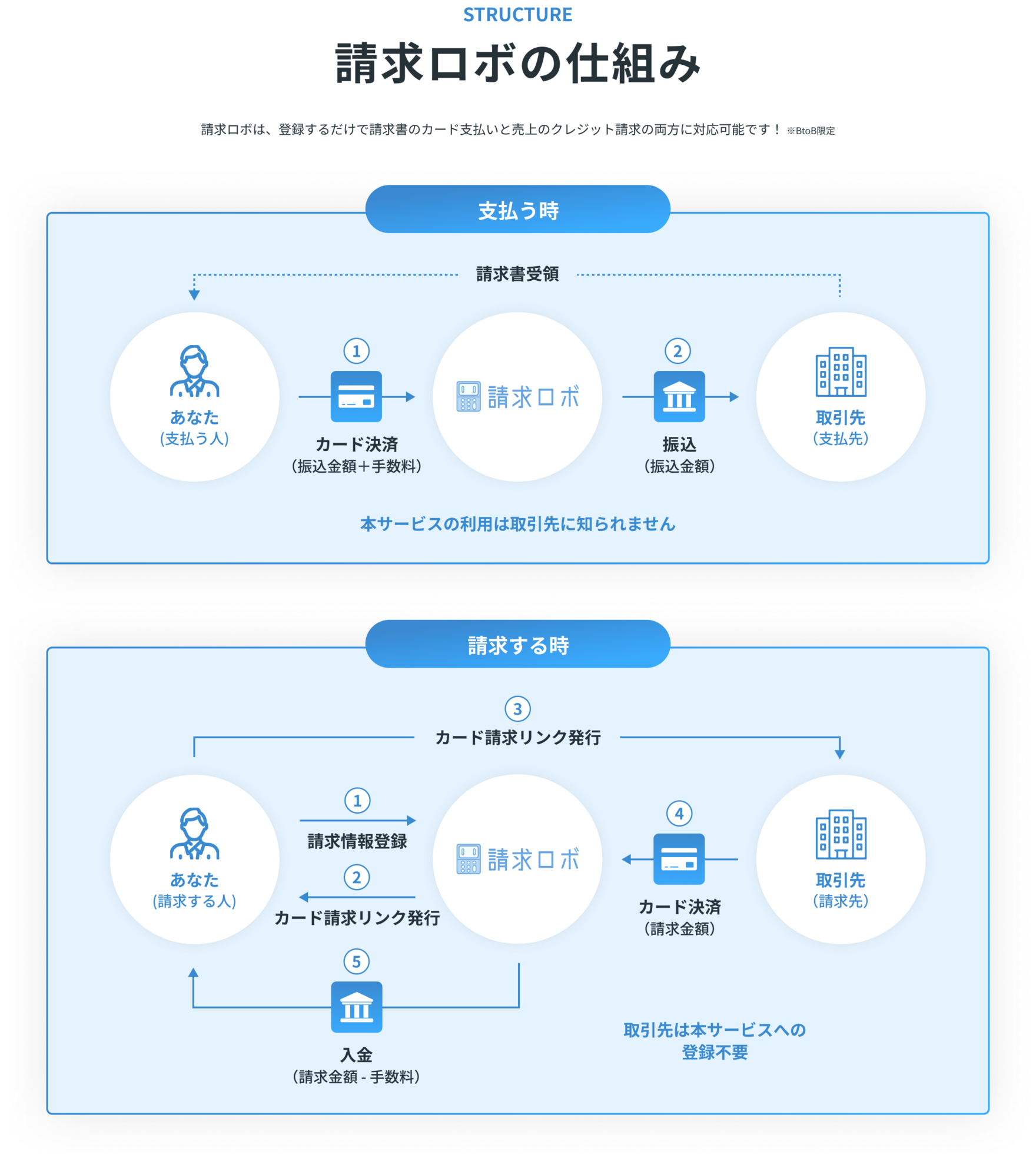 「請求ロボ」は、BtoB向けのクレジットカード決済により資金繰りの改善をサポートするサービスです。