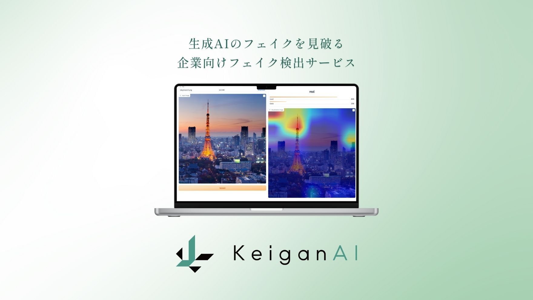 KeiganAIは、画像・動画・音声・テキストをAIで解析し、フェイクデータや情報の正誤を検出・判定するツールです。