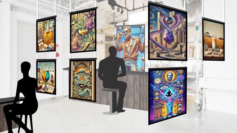 AIソクラテスとの対話を体験した後には、オリジナルのカクテルカードをプレゼント!カードには、古代ギリシャの哲学者ソクラテスと現代のあなたが対話した内容を反映したオリジナルのイラストが描かれ、「古代の知恵 × 現代の悩み」という対比がユニークなアートとなります。イラストを友人に見せて「こんな相談したんだ!」とシェアしたくなる、哲学的な問答とアートを通じて深い気づきを持ち帰る、展示イベントの思い出として唯一無二のビジュアルを手に入れる、そんな楽しみを参加者に提供いたします。