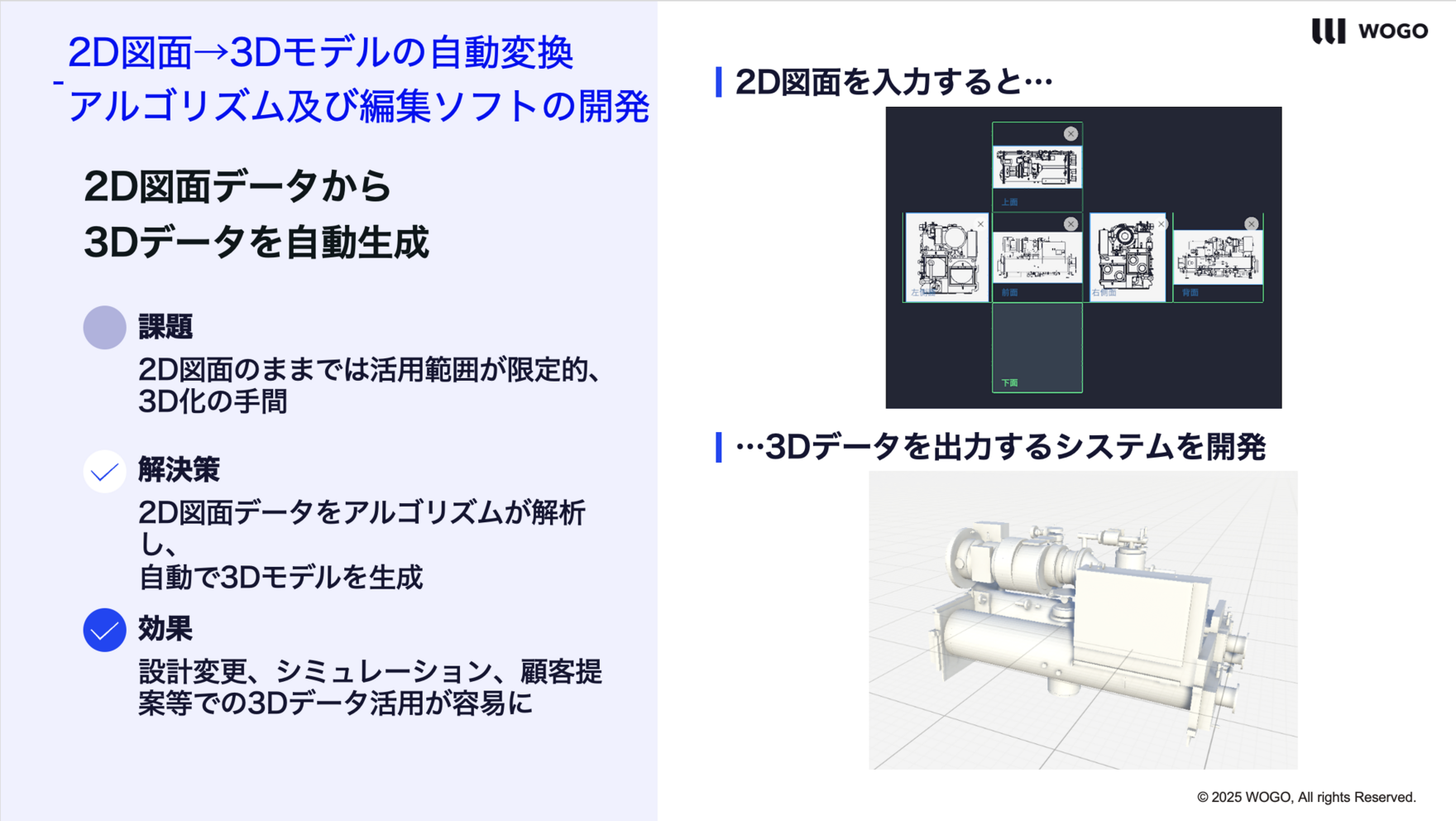 株式会社WOGO(CEO:秦 竟超)は、三機工業株式会社(社長:石田 博一)と共同で、設備機器の2D図面から3Dモデルを自動で生成するアルゴリズムと、統合編集ソフトウェア「TRANDIM」を開発したことをお知らせします 。本開発により、従来、手作業で行っていた3Dモデル作成の工数を大幅削減することに成功し 、建築設備業界全体の課題であった3Dモデル作成時間の短縮とコスト削減に大きく貢献します 。