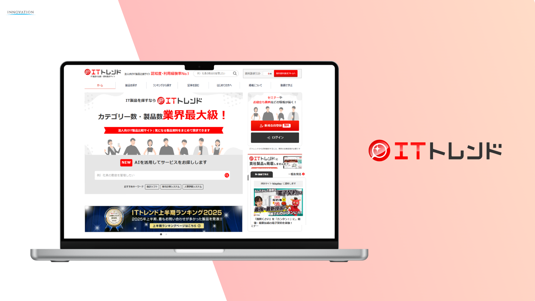 ITトレンドでは、1,900以上のIT製品・サービスを掲載中。製品カテゴリーや人気製品ランキング、導入事例などからIT製品・サービスを探して比較することができます。また、比較・検討に役立つテーマの記事コラムも掲載していています。