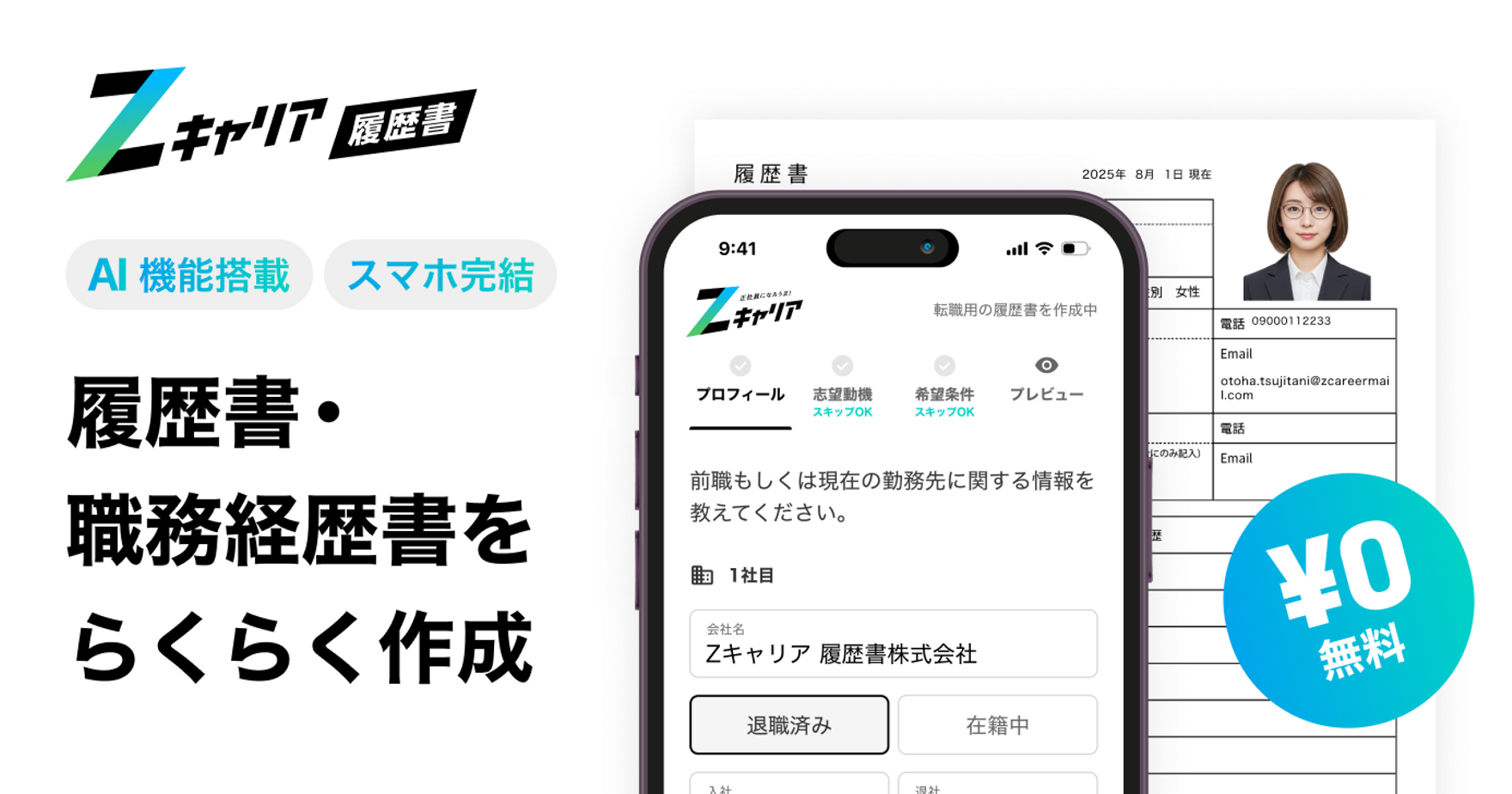 「Zキャリア 履歴書」では、生年月日を入力するだけで学歴情報を自動で補完し、4つの設問に答えるだけでAIが志望動機を作成します。「やりたいことが決まっていない」「どう書けばよいかわからない」など、自分の考えをうまく言語化することが苦手な方でもAIが就職活動をサポートします。作成した履歴書はクラウド上に保存され、専用アプリ不要でいつでもコンビニのマルチコピー機から簡単に印刷が可能です。