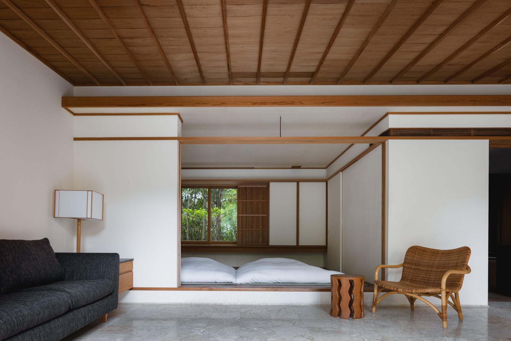 松林と富士の伏流水が湧き出る水盤を望むわずか8室の客室、名建築で過ごす至福のひとときを提供いたします。