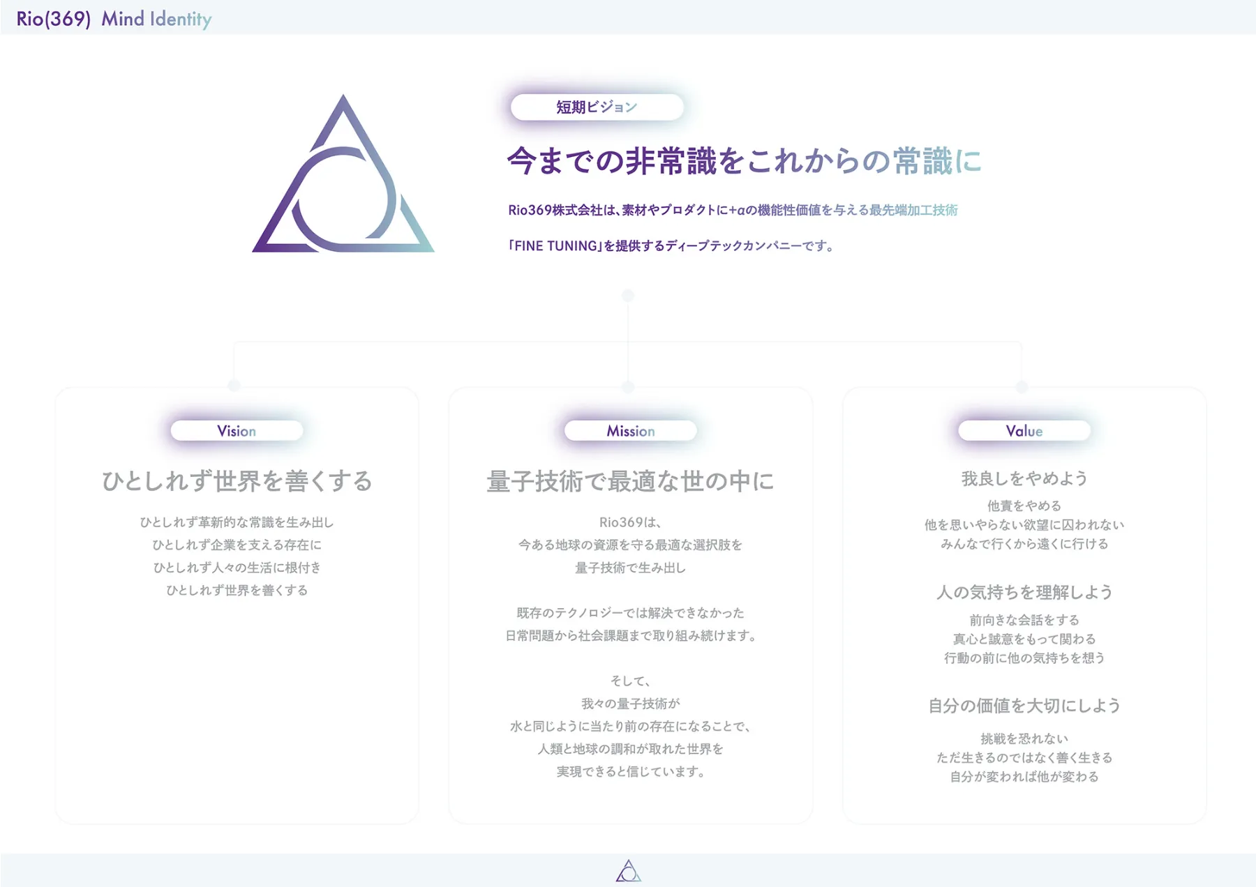 企業理念の策定からVI開発、ウェブデザインまで担当。広く認知されていない量子力学というテクロノロジーを扱う企業として、サービスの説明ができず苦労されていた。そこで、ディープテックカンパニーという既存のジャンルに身を置くことでポジションを宣言。ただし、ウェブサイト自体でサービスを理解してもらうことは難しいと判断し、「今までの非常識をこれからの常識に」というブランドコンセプトを掲げ、未来を創るディープテックカンパニーとしての期待感やテクノロジー感といった感情のデザインをすることにフォーカスし制作した。