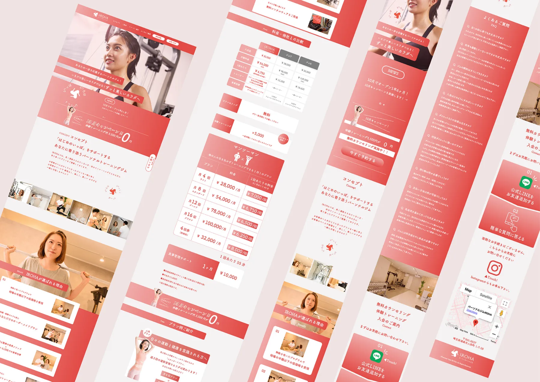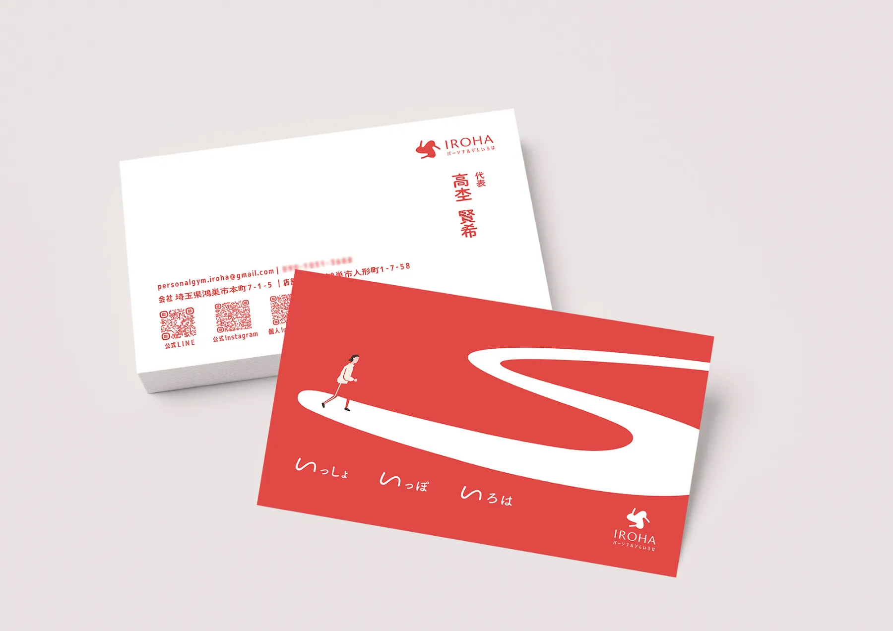 ブランドコンセプトの策定からVI開発、店舗デザインまでを担当。ご実家で経営されていた旅館「いろは」のネーミングを踏襲。お客様へ寄り添う姿勢や、一時的ではなく人生を通して健康で過ごせるように丁寧に指導する内容から「いっしょ、いっぽ、いろは。」というブランドコンセプトを開発。そのコンセプトを中心に各種クリエイティブを制作した。