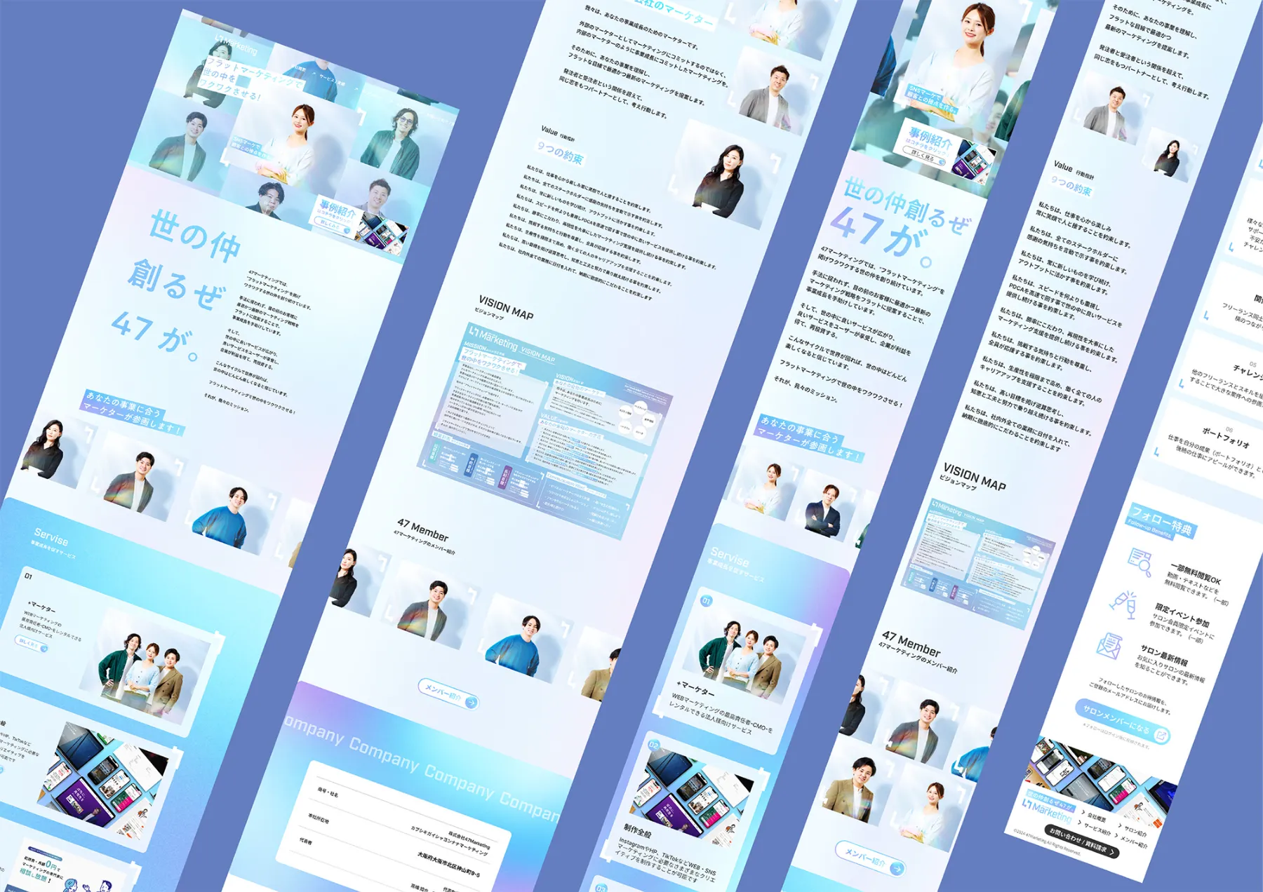 企業理念の策定から、ブランドコンセプトの策定、VIの開発から、クリエイティブの制作まで担当。手法に捉われず本質的な課題解決を目指す戦略の立案から行う「フラットマーケティング」を掲げサービス提供をしていることから「世の仲創るぜ47が」というブランドコンセプトを策定。このブランドコンセプトを軸にロゴからウェブサイトに至るまで展開。47フレームというデザインシステムがビジュアルアイデンティティを強固なものにしている。
