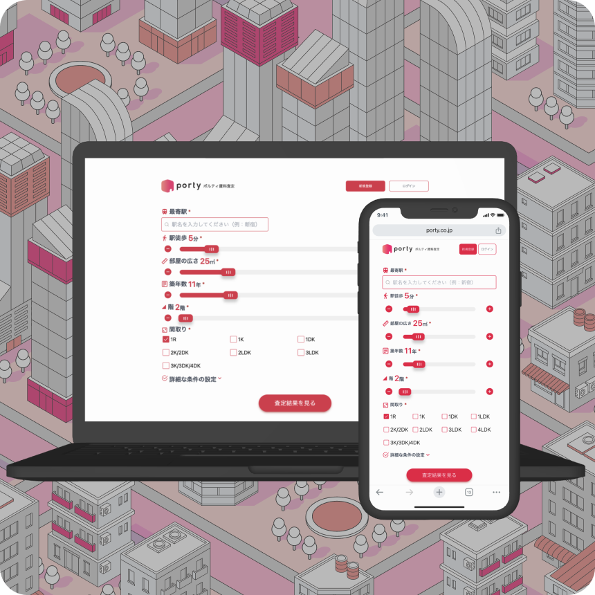 「ポルティ賃料査定」は数多くのお客様にご利用いただいているAI査定サービスです。 最短10秒の入力で、web上で誰でも簡単に物件の適正な家賃を調べることができます。