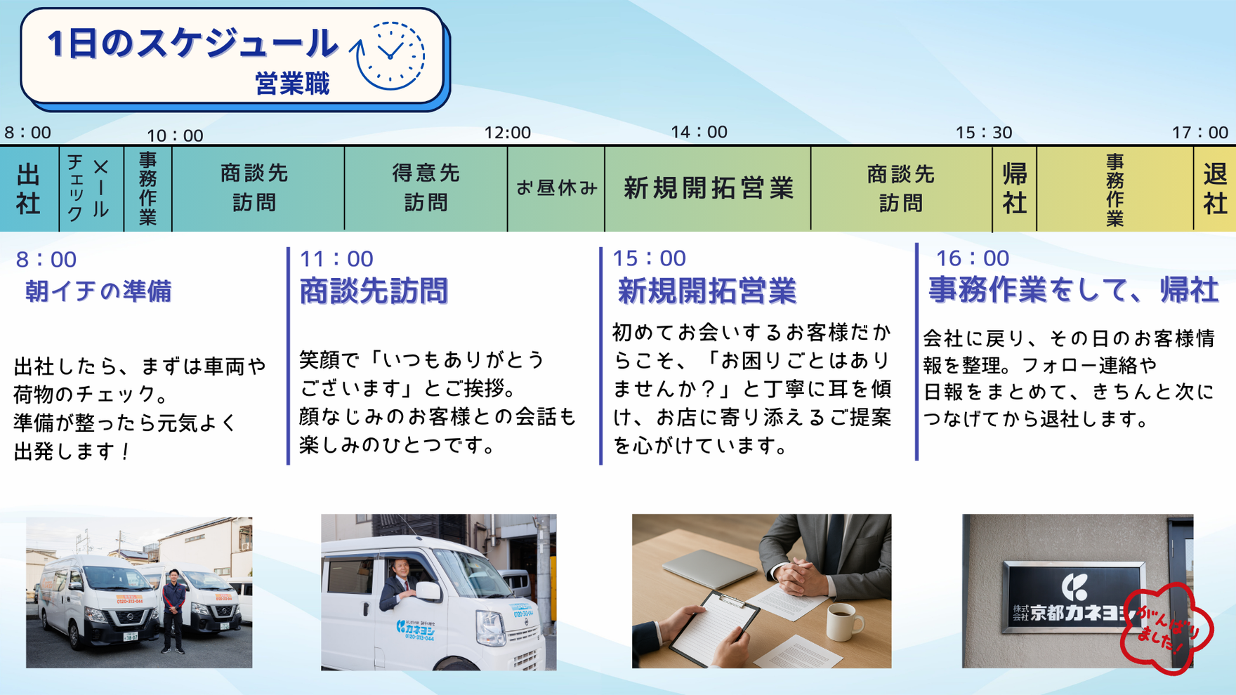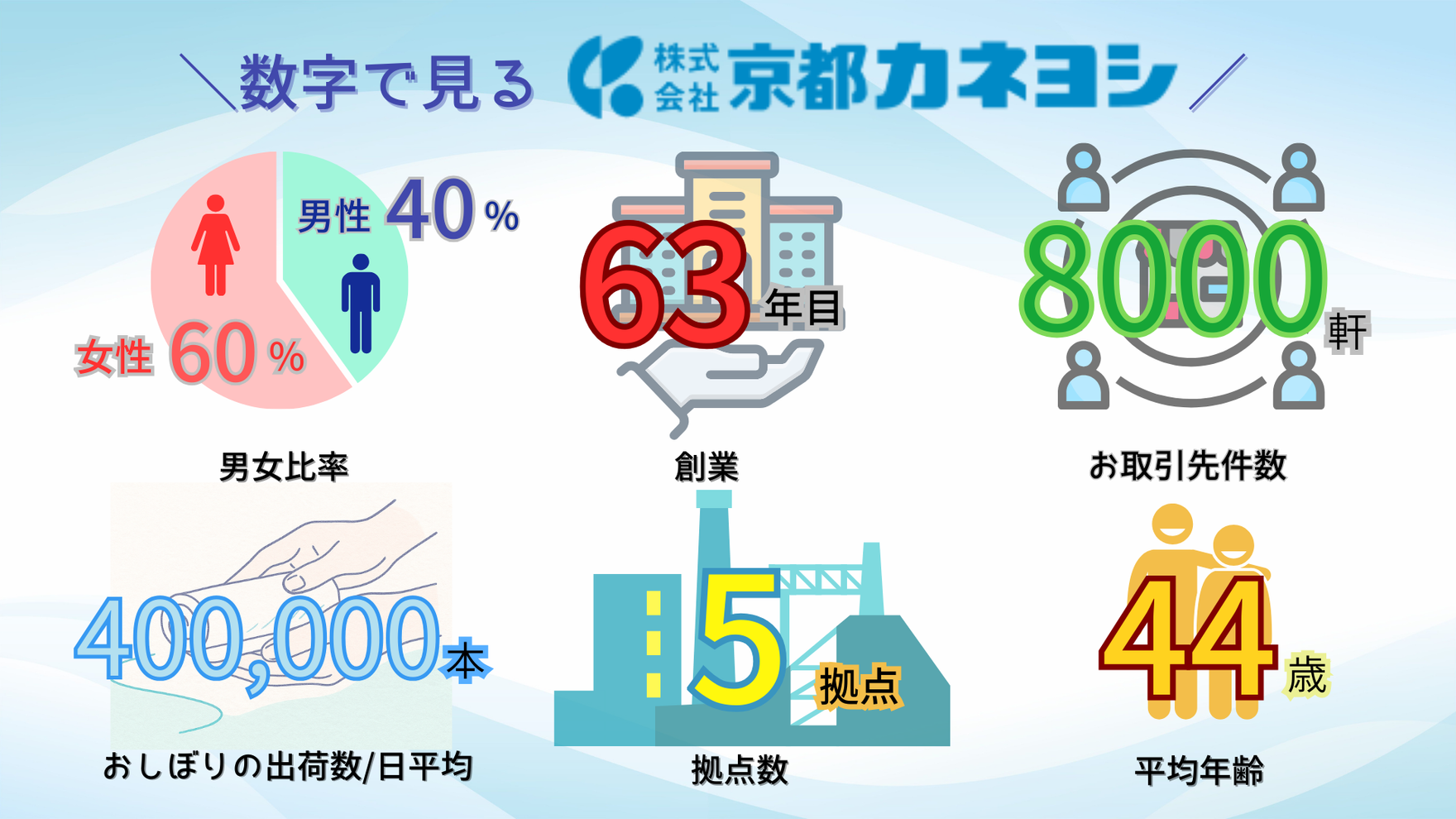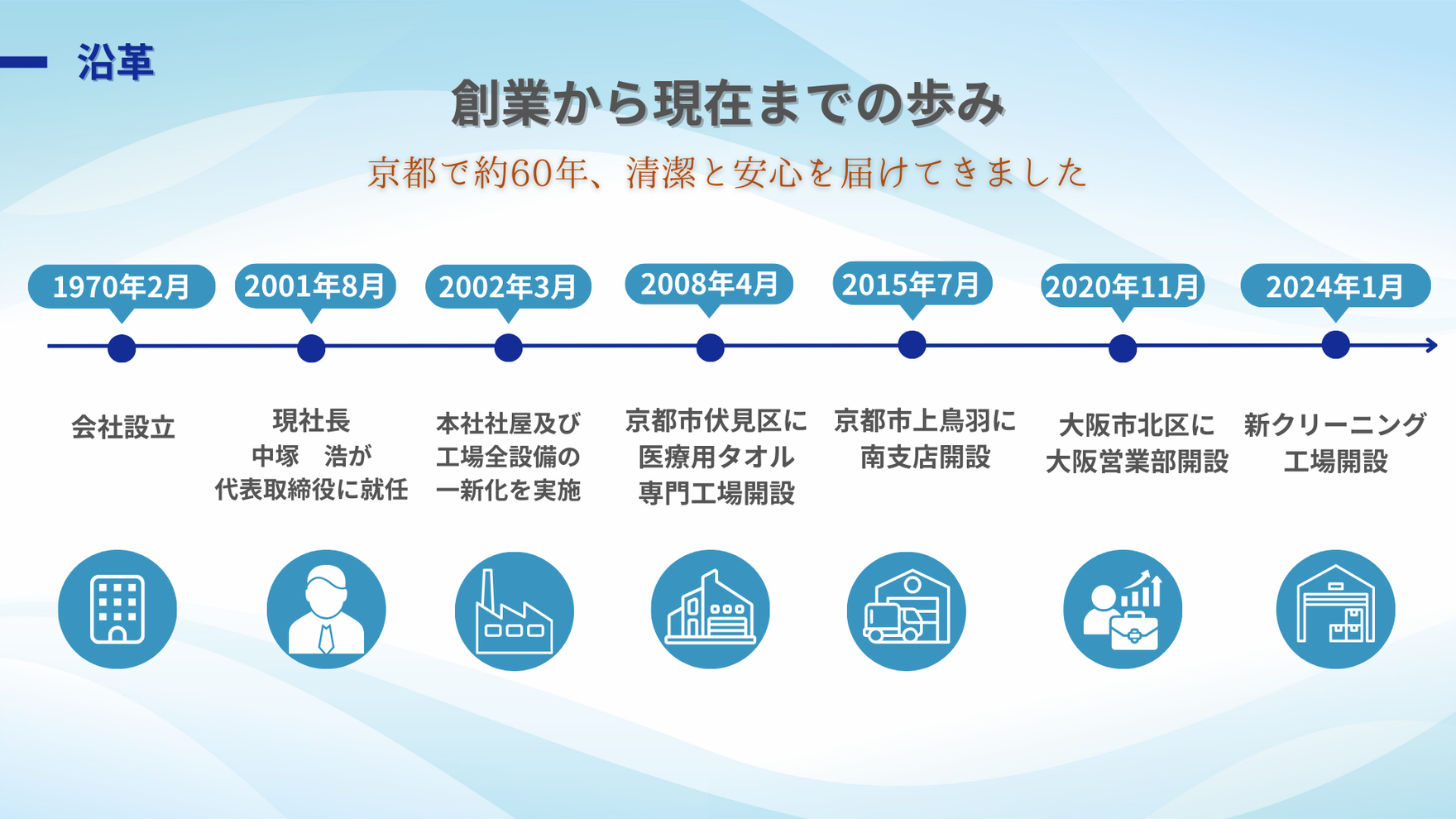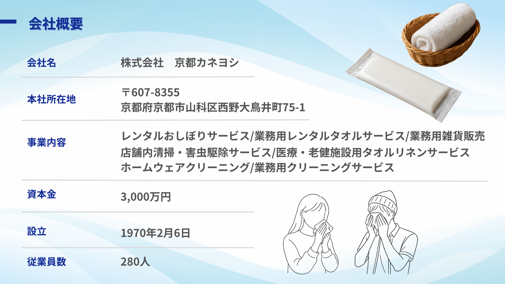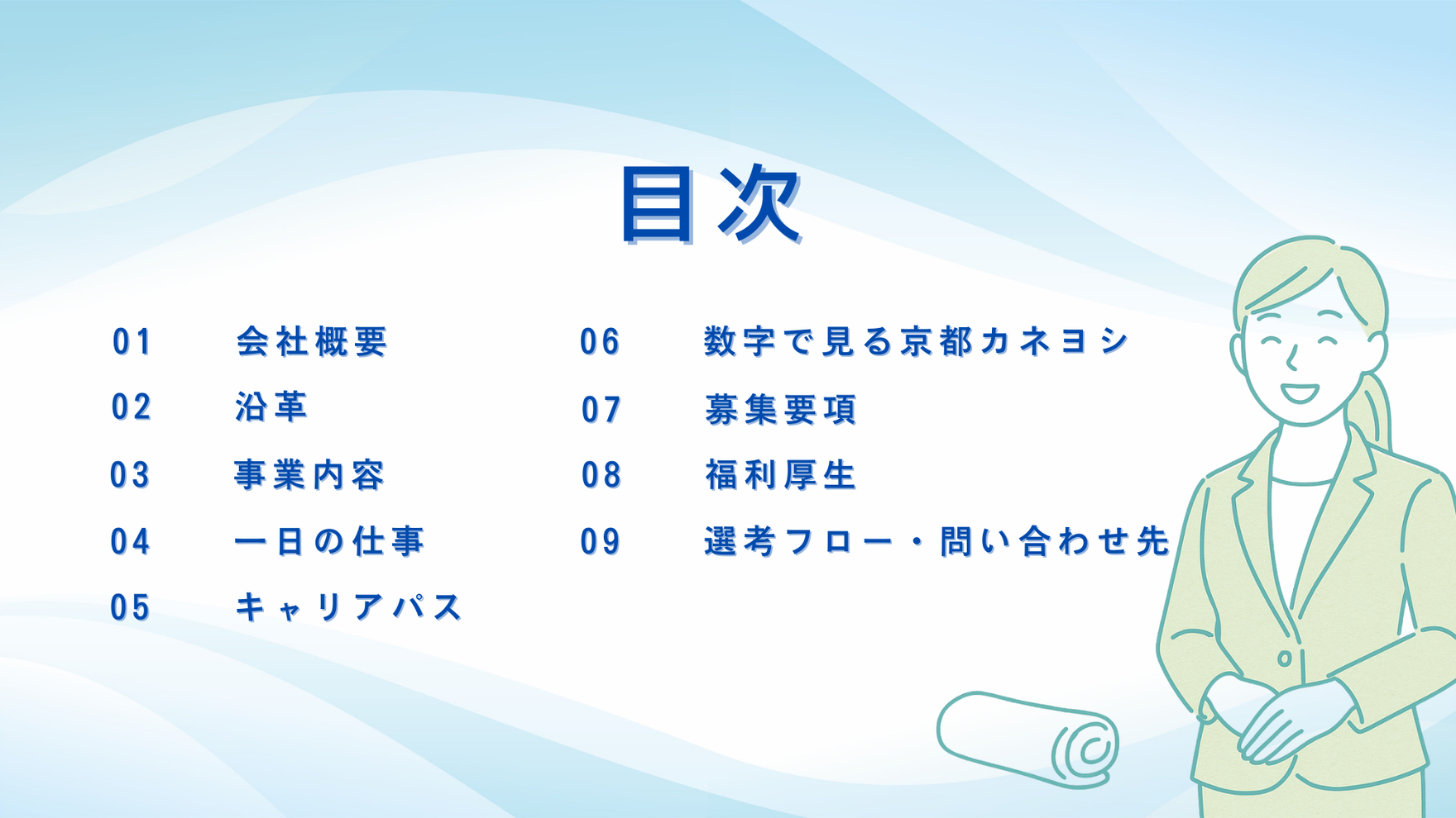 京都カネヨシがどんな会社なのか、ぱっと見てわかるように、歴史や仕事の流れをギュッとまとめた資料を作りました。