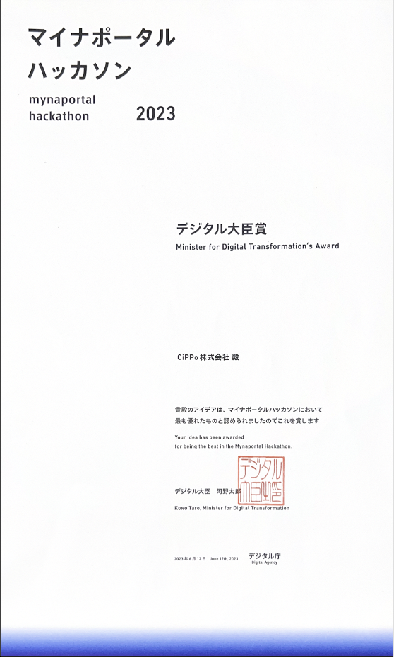 マイナポータル ハッカソン2023 デジタル大臣賞を受賞! 地域アプリとマイナポータルAPIを繋ぎ、生活困窮者支援のアイデアにて最も優れたものとして表彰いただきました。