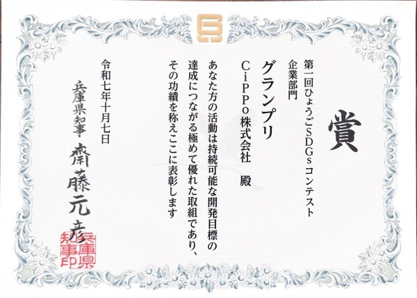 このたび、当社 CiPPo株式会社 は、令和7年10月7日に開催された「第1回ひょうごSDGsコンテスト」(主催:兵庫県)において、グランプリ(最優秀賞) を受賞いたしました。