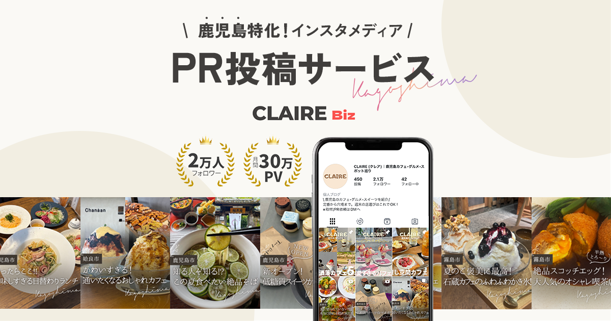 CLAIRE Bizは、東京・川崎・鹿児島エリアに特化したInstagramメディアを活用し、飲食店・観光地の魅力を届けるPR投稿サービスです。「CLAIRE」や「東京グルメ手帖」など地域密着の人気アカウントにタイアップ投稿することで、地元の人や旅行者の「次はどこへ行こう?」というタイミングにしっかりアプローチできます。