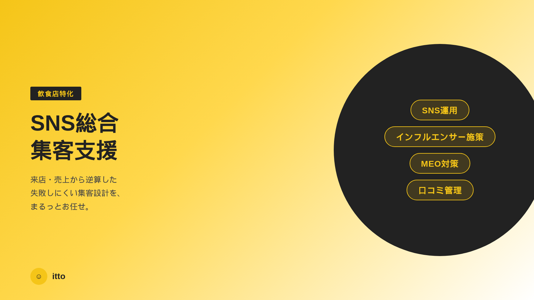 「狙って繁盛させる」をコンセプトに、飲食店に特化したSNS総合集客支援を提供しています。