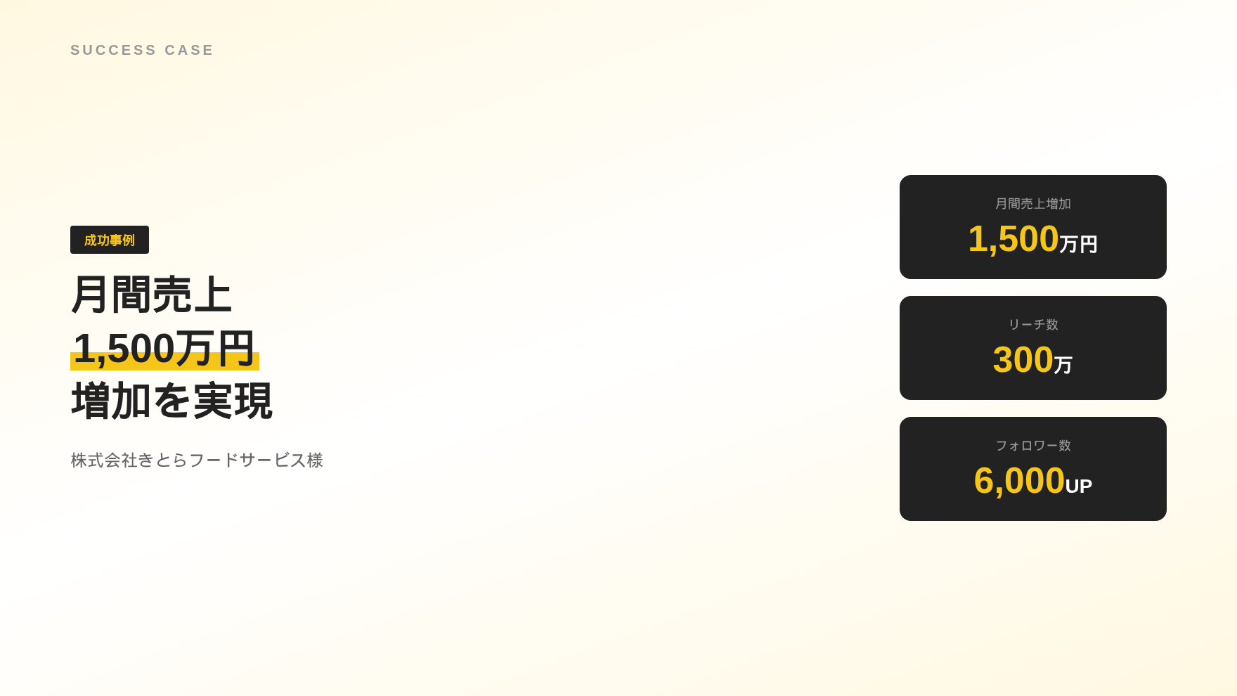 焼肉、寿司、居酒屋、カフェなど幅広い業態の飲食店を累計1,300店舗以上支援してきました(2026年2月現在)。売上アップ率は最大300%。