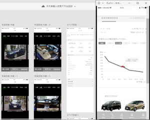 アプリのUIイメージ。車の詳細も分かりやすく。相場検索もできます。