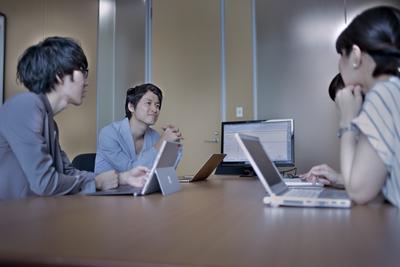 フリースペースでディスカッションするスペースもあります。フルフレックスで、柔軟な働き方が可能です。