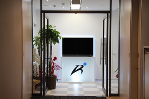 大阪本社のエントランス。会社の顔となるため、常に清潔に保たれています。今は、消毒液と自動検温機が設置されており、感染対策を徹底しております。
