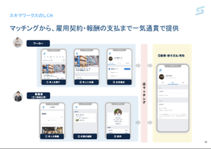 スキマワークスは"人手が欲しい企業"と" スキマ時間に働きたいワーカー"の2つを結びつけるスキマ時間に働ける単発ワークプラットフォームです