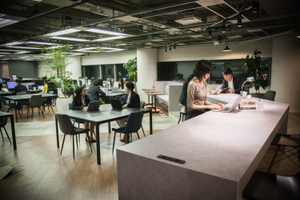 トップランク本社。部署ごとの壁がない開放的な空間。 そして、いつでも誰でも使えるフリースペース。 午後6時からいろんな社員とコミュニケーションが楽しめる バーカウンターがあります。