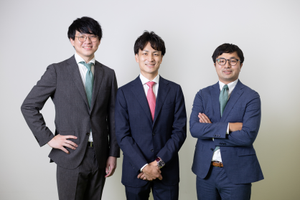 左から順に:取締役CFO 平岡・代表取締役 佐藤・取締役COO 山本