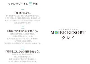 『日本人の美意識と宿屋の美学を追求し、お客様に忘れがたい時間を提供します』 という経営理念に基づき、三か条を掲げ、8つの約束が書かれた「クレドカード」を常に携帯しています。 モアレリゾートの働き方は、 「すべてはお客様の喜びのために」と専門分野を生かしつつ、それを超えたあらゆる場面でお客様に感動していたけるようマルチタスクが基本。 お客様の滞在の流れにそって複数の業務を担当するので、チームワークがとても大切です。 仲間との連携をかかさず、よりよい最高のおもてなしができるようしっかりとコミュニケーションが必要です。 その為には、本部キャンパス・モアレアカデミーでの研修制度は不可欠です。 外部から講師をお招きし、新たなる学び。 そして仲間同士でのアドバイスを出し合い、反省、努力、成果を話し合う時間は貴重な場となっています。 そして、イベントやキャンペーン、販促活動等の企画も意見を出し合いながら、新規顧客の獲得やお客様の満足度向上に繋げています。