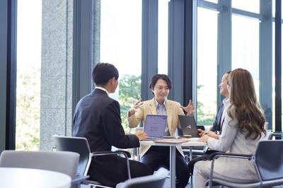オープンスペースでの会議。いろいろな職種のメンバーが集い、和気藹々と議論しています。