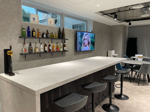 仕事後の軽い乾杯や、社内メンバーでのスポーツ観戦、チームでのランチ会などで利用できるバーカウンターを設置しています。もちろん、気分転換にここで仕事もできます。
