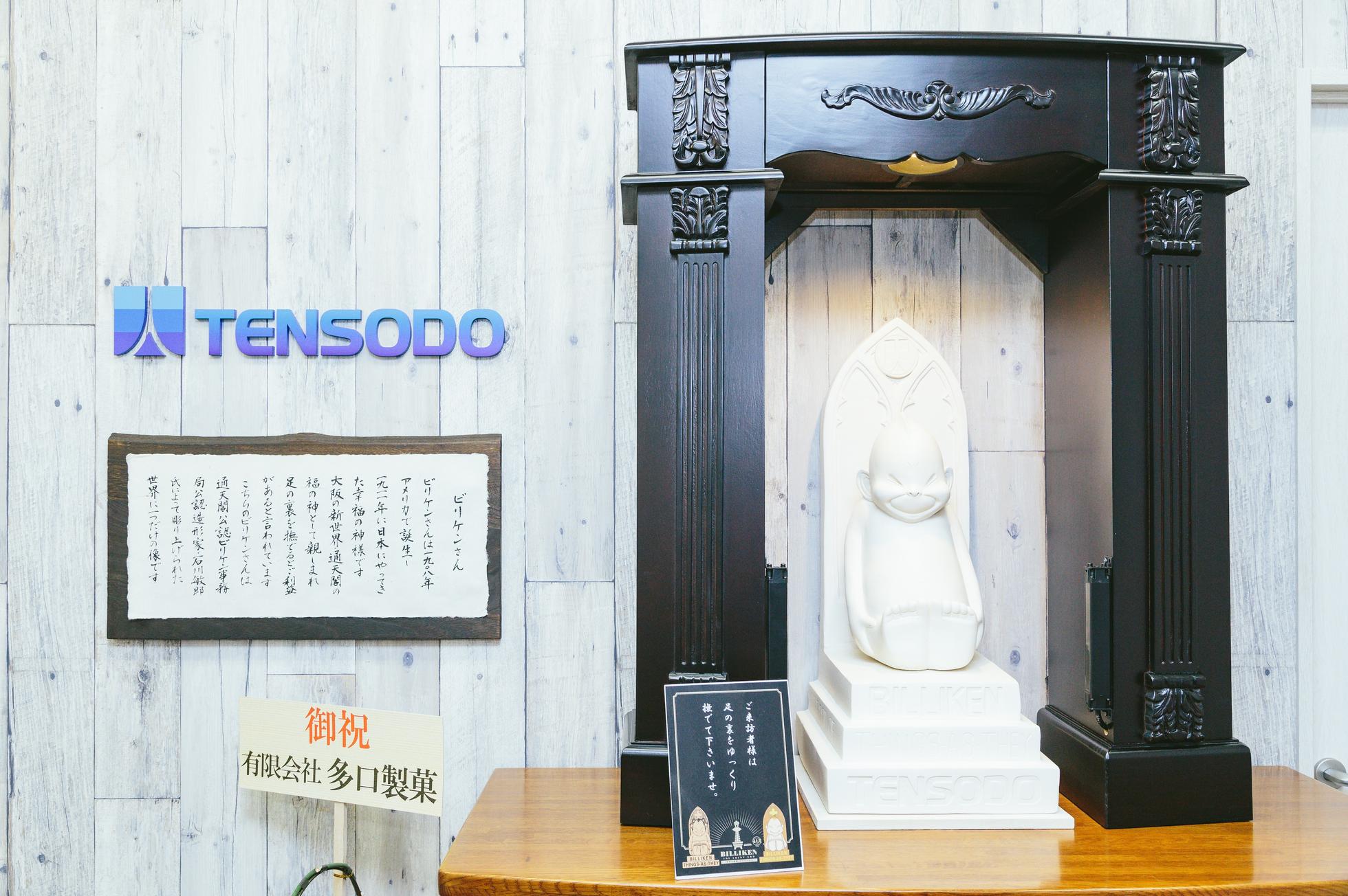 本社のエントランスには、手彫りのビリケン像が鎮座。皆さんにとって今日もご利益がありますように!