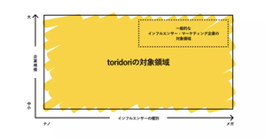既存のインフルエンサーマーケティングの主戦場となっている 「大企業×有名インフルエンサー」領域はもちろん「中小企業や個人事業主の方やフォロワー数1〜2万人の "マイクロインフルエンサー "まで、幅広い領域に価値を提供できる」ことが、toridoriの強みです。