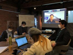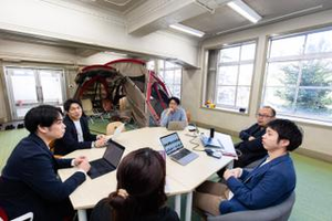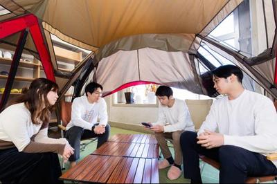 社内でのミーティング風景です。昭和初期に建設された旧下京図書館(元淳風小学校隣)をリノベーションさせていただき、開放的かつ落ち着いた空間でアイデア創出を図っています。煮詰まったらテントへ!もとは知恵の発信地としての図書館でしたので、現代版の智慧の発信地として地域での役割を担っていきたいと思います。