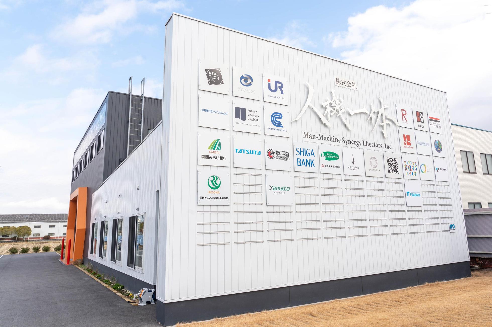 人機社のパートナー企業様のロゴを秘密基地の妻壁に設置しています。多くの企業様にご協力いただき、人型重機の社会実装に向けて取り組んでいます。