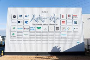 人機社のパートナー企業様のロゴを秘密基地の妻壁に設置しています。多くの企業様にご協力いただき、人型重機の社会実装に向けて取り組んでいます。