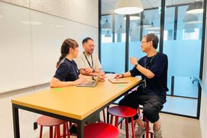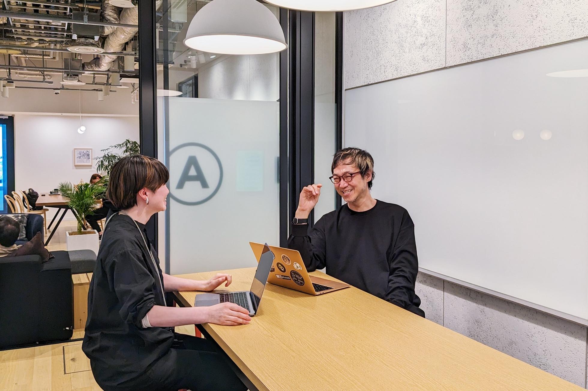 プロジェクトごとにチームを組みます。この日は他拠点で仲良くなったクリエイティブディレクターと打ち合わせ。何年も一緒にやっているので、社外や社内の垣根はありません。