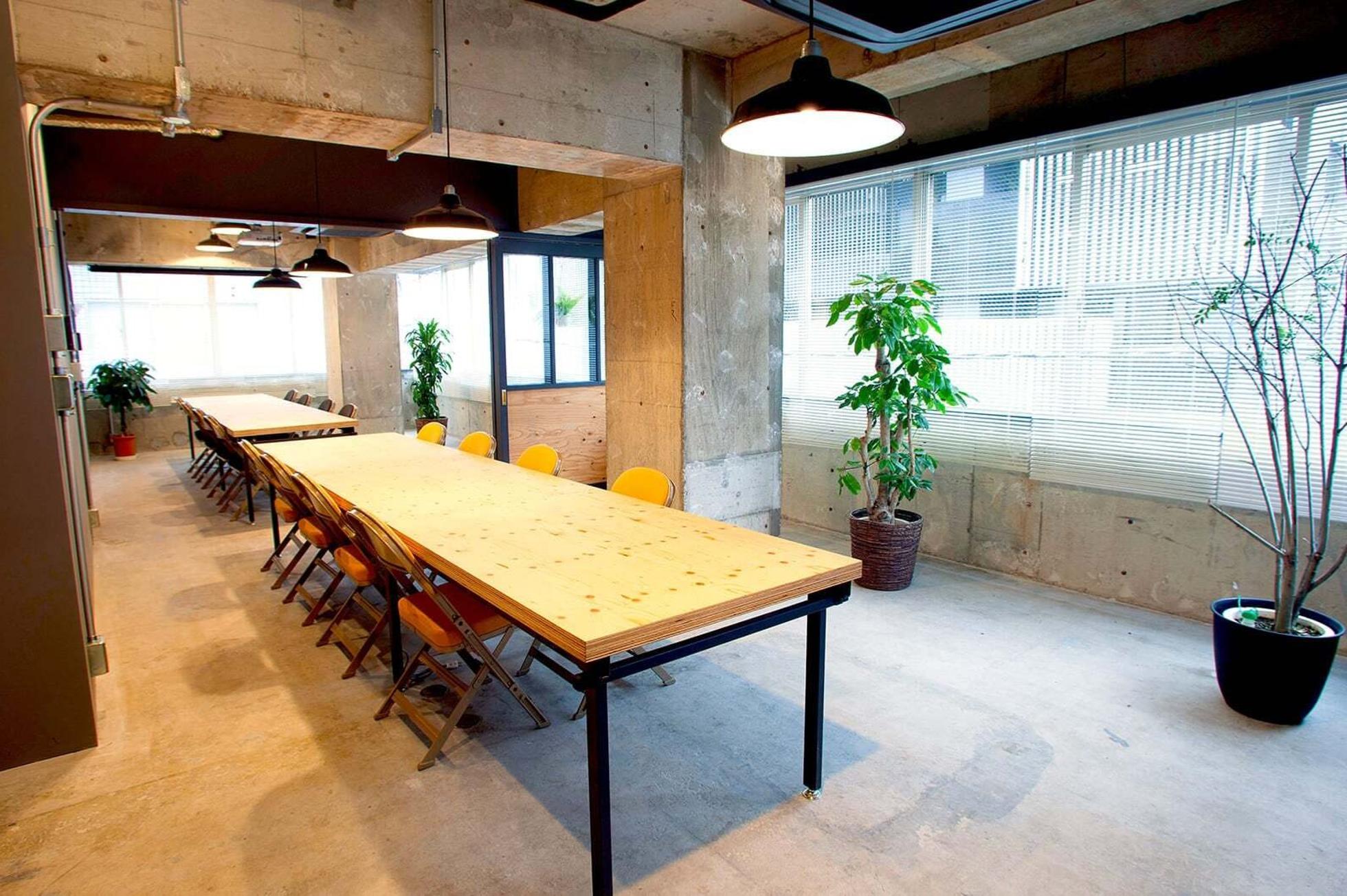 Meeting Room:昼夜ともに来客も多く、多目的に活用されるミーティングルームは、シェードランプとスポットライトで充分な光度を確保。可動式の間仕切りを解放すると30名程度が着席できる空間になるため、オーディションなどにも多く利用されています。