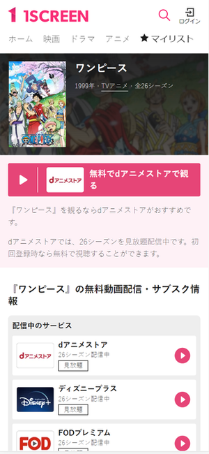 『ワンピース』の配信情報を1Screenで検索(https://1screen.tv/jp/tv/8621 )