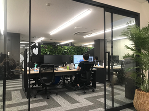 グリーンウォールが自慢の、リラックスして仕事が出来る執務スペースです。イスはエルゴヒューマンとオカムラから選んでいただけます。