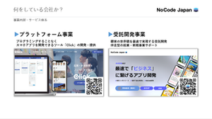 \"誰もがアイデアを形にできる世界の創出"/ 発想や直感を生かし、創造性とテクノロジーの融合で社会を革新する新たな未来を拓く。 夢の実現に向けたプロダクト開発を「Click」と「Professional Team」で後押しします。 【事業内容】 ◎「Click」 クラウド型ノーコード開発プラットフォーム「Click(クリック)」を提供しています。 起業において難易度の高いプロダクト開発を、プログラミングの知識がない方でも直感的な操作で開発できます。これまで空想でしか無かった、素晴らしいアプリケーションのアイデアを実現できます。 ▶https://click.dev/ ◎「Professional Team」 顧客にとって最適なアプリ開発をノーコードとコードを組み合わせて高度な要望・要件に対応する受託開発事業です。ノーコード開発の強みである開発スピードと操作性はリーンスタートアップに最適であるため、企業の新規事業案件やベンチャー企業から高い支持を得ています。 MVP開発をしながら仮説検証を行い、顧客とともに伴走していく姿勢で戦略立案から開発までトータルにサポートをします。 ▶https://www.appdev.nocodejapan.org/sysdev