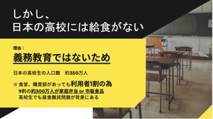 【PECOFREEの事業目的について】 =============================== 〜「食」であらゆる人がつながり、HAPPYな世界をつくる〜 私たちの事業は今ある明確な課題を解決していきながら、サービスやプロダクトもそうですが、新たな文化の創出を目的としています。 この目的を経て、働く子育て世帯の活躍促進、女性躍進、共働き世帯の負担削減や学生の健康と食育を進め、 繋がる産業の活性化と需要と供給による消費をつなぎ、新しい食のインフラストラクチャーを作り上げます。 =============================== なぜやるのか ▼日本の学校における昼食課題 日本の高校は義務教育ではないため、学校に給食の制度がなく、生徒は弁当を持参、または食堂や購買部で昼食を購入しています。 日本の高校生人口は約350万人という中で、食堂や購買部の利用者は1割程度と言われており、残りの9割(=約300万人)は家庭弁当の持参や市販食品の購入をしていますが、栄養バランスの偏りや、おにぎりやパン1つで済ませてしまうなど、高校生の昼食難民問題があります。私達はこの課題をPECOFREEのプロダクトで解決します。 ▼子育て共働き世帯の増加と負担 現在日本の共働き世帯は68.8%を占め、子育てをする保護者も時間に余裕がないのが現実です。 また子どもが産まれ、子育てが少し落ち着き、働きに出ようとしても家事、育児が終わることはありません。 小学校では長期休暇期間では給食がなく、学童施設に行かせようとしても手弁当が必要で苦慮したり、高校からは朝から早起きして、毎日手弁当を作ってあげてから仕事に向かう保護者が多いと思います。 私達はこの課題をPECOFREEのサービスを通して解決します。 ▼学校、教育機関の食のインフラが乏しい 高校の学食、購買部の全国による設置割合は6割と実は少ないことを知っているでしょうか? そして現在その学食と購買部も全国で撤退が相次いでいます。実は日本では学食事業は不採算事業と呼ばれていて、CSR的要素が大きく、収益性が中々見込めません。しかし学校での食のインフラが無くなってしまうと学生と保護者の悩みに直結していきます。私達はこの課題をPECOFREEのプロダクトで解決します。 ▼サプライヤーの収益低下 PECOFREEは学校機関とサプライヤーを繋ぐプラットフォームのため、産業給食というサプライヤーが重要です。産業給食とは弊社代表も前職は従事しており、1日10000食以上製造する法人の昼食お弁当や民間業者として幼稚園や中学校給食、学食事業などを製造・配達する会社のことです。スケールメリットによる大量生産で安価な食事を提供できることができるレガシー産業ですが、コロナ禍によるリモートワークの増加、少子化による給食の食数低下などにより、製造食数が減ることで収益低下を危惧する現状があります。それは食材仕入れ会社、畜産農家にも影響を与えており、給食業界また地域経済にも大きなマイナス要因を起こすことになります。私たちはこの課題を解決するため、PECOFREEは新しい未開拓市場を創出することでサプライヤーの収益最大化、また雇用の創出と生産からの消費を生み出していきます。