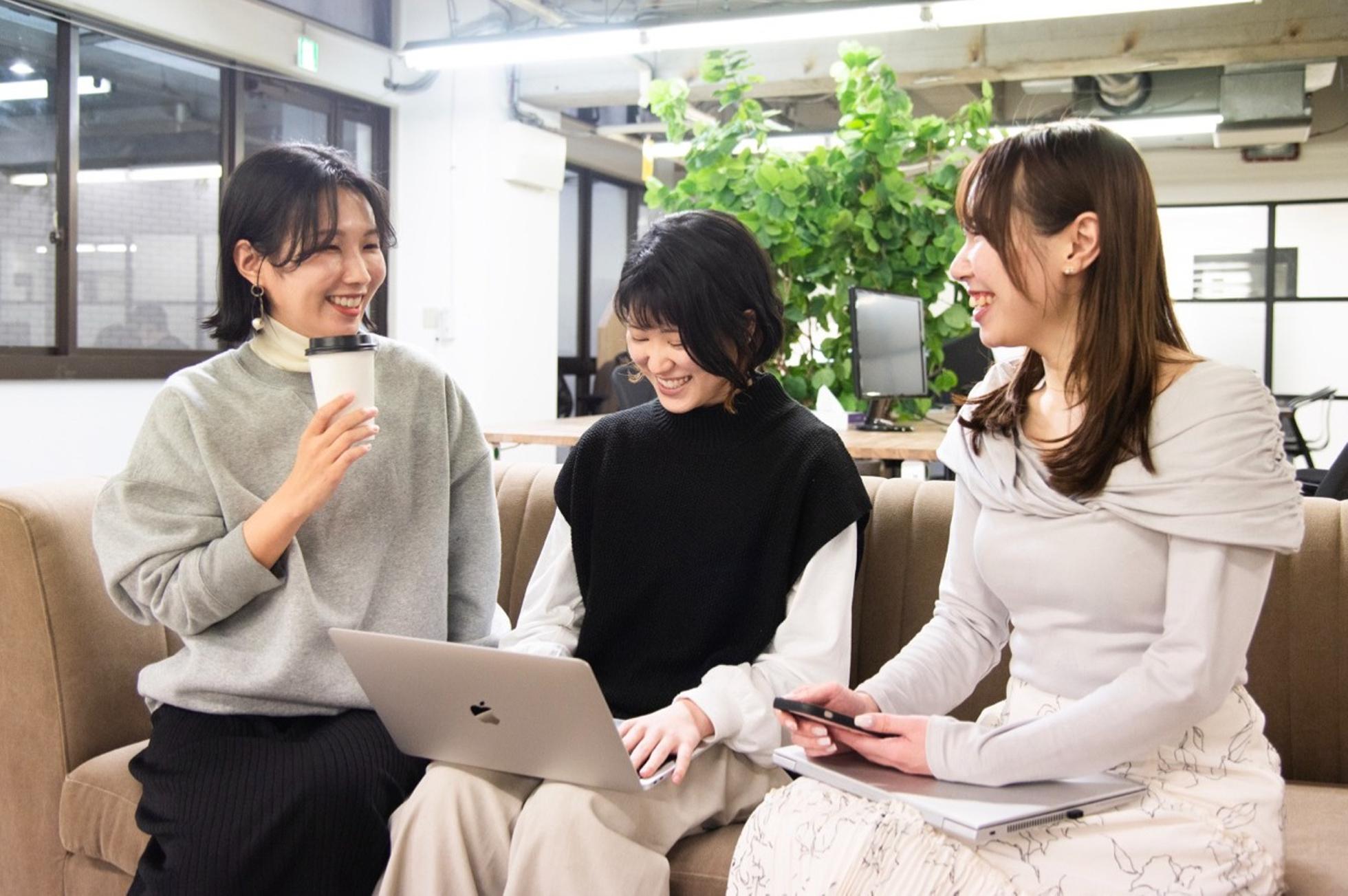 職場は20〜30代を中心に様々な年齢・バックグラウンドのメンバーで構成されています。おしゃべりをすることが好きなメンバーが多いので、オフィスに集まれば雑談・仕事の相談などいろんなところで自然と会話が生まれています。この写真は社内動画撮影のシーン。採用向けの動画を撮影しているところです。