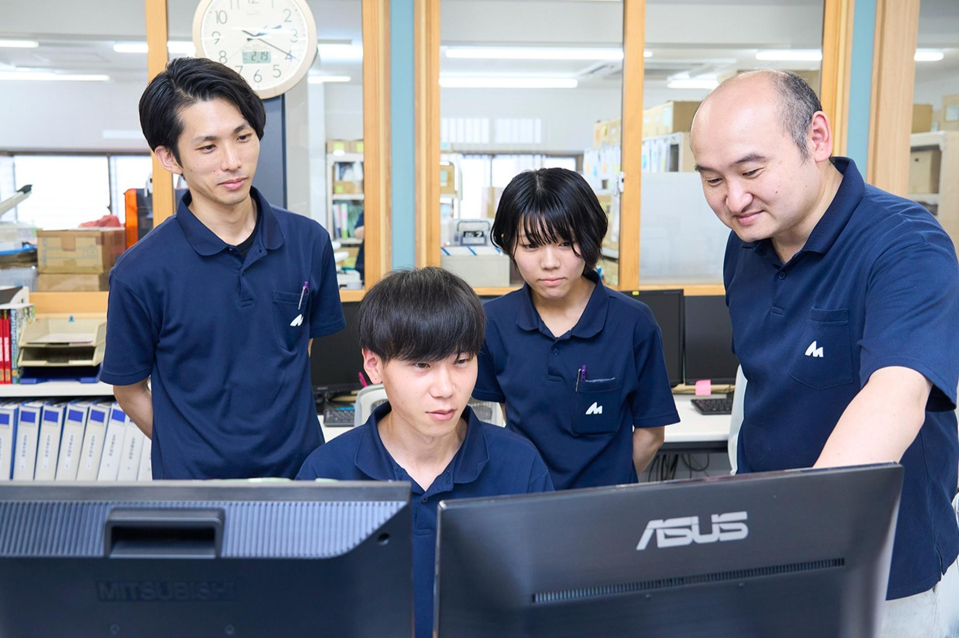 ミヨシの技術職は分業制をとっていませんが、時には先輩社員に相談しながら仕事を進めることも。お互いに助け合いながら仕事を進めていくのもミヨシの魅力です。