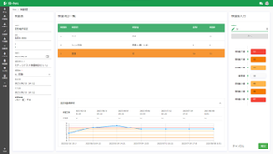 検査結果登録画面です。閾値(不良品となる判定ライン)を超えたものをその程度に応じて強調表示したり、過去の検査結果をグラフで推移表示したりして、検査内容を直感的に把握できるように工夫しています。また、設備に異常が発生すると推移にばらつきが生じるため、この画面から設備の不具合をいち早く察知することもできます。