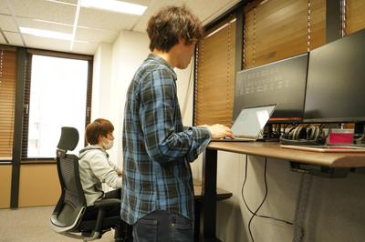 スタンディングでも作業できるよう、デスクは昇降機能付き