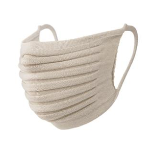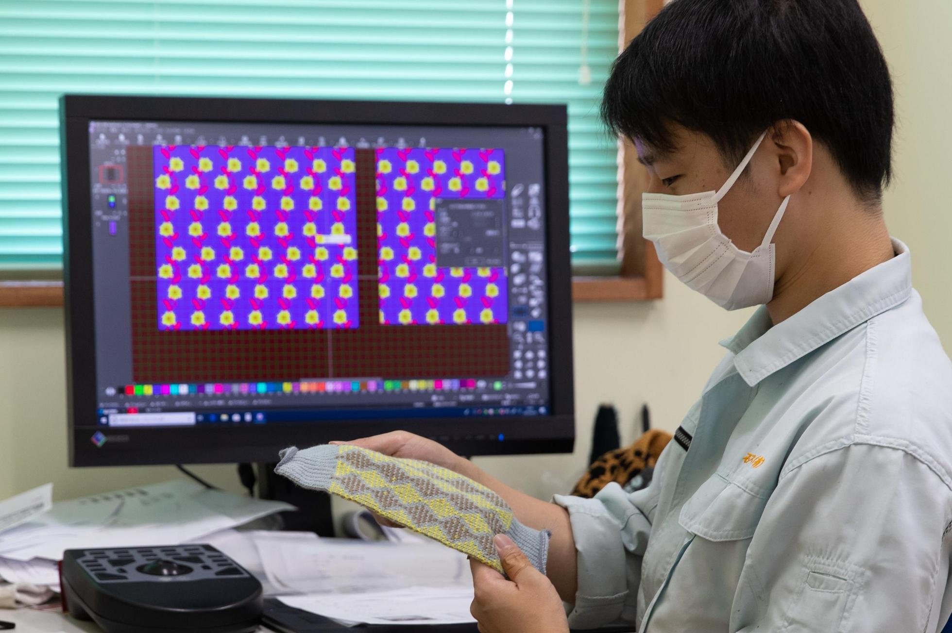 コロナ禍で開発してヒットした「ニットのプリーツマスク」。自動横編み機を約150台揃え、あらゆるニット小物を企画して生産する体制が整っています。