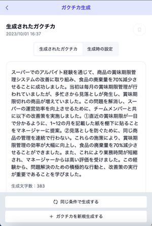 α版の開発画面。文字数の指定と箇条書きで要素を書けば自動的にガクチカを作成する機能