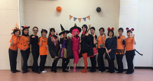 ハロウィンの仮装で集合。先生のイメージって硬いという人も、でも私たちは楽しい、面白い、すぐまとまれる。そんな仲間たちです。
