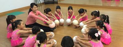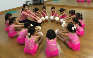 キッズクラスの授業風景です。ボールを用いて、柔軟の練習。