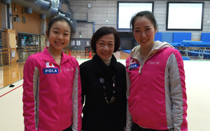 新体操日本代表「フェアリージャパンPOLA)の杉本早裕吏選手(右)・竹中七海選手(左)・主宰の南 麻美(中央)。合宿の写真です。2人共、みなみ新体操クラブで、小さい時から一生懸命練習しました。