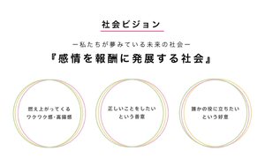 社会ビジョン「感動を報酬に発展する社会」。 私たちは、お金のような外から与えられる快楽を目的にするのではなく、みんなが自分の心の満足を目的に動いている社会を実現させるべく活動をしています。