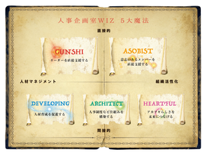 「人を育てるのは、結局、人」という思いの下、立ち上げた当社の人事企画室WIZ。現場メンバーへの直接支援にこだわり、この5領域を担っています。