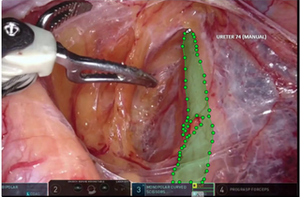 アノテーションの様子。内視鏡映像に映る尿管を可視化。臓器の境界まで精緻にアノテーションしています。